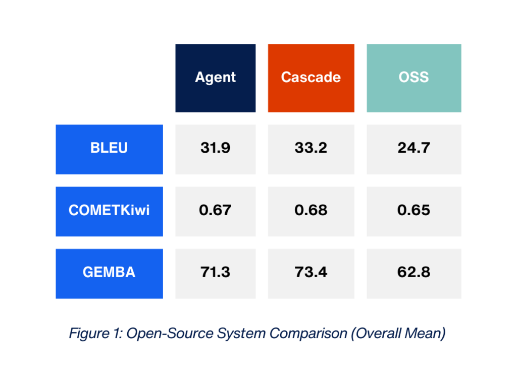 After splitting the data into 308 utterances, we created expert reference translations and scored outputs using three industry-standard machine translation metrics: BLEU, COMETKiwi, and GEMBA. The correlation analysis shows these metrics largely move together, reducing the chance that any single score is driving the conclusion.Â